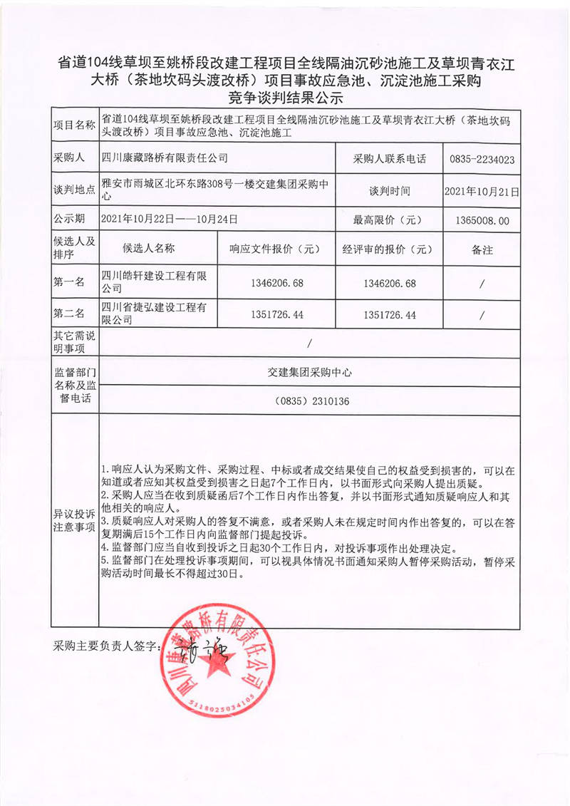 四川康藏路橋有限責任公司省道104線草壩至姚橋段改建工程項目全線隔油沉砂池施工及草壩青衣江大橋(茶地坎碼頭渡改橋)項目事故應急池、沉淀池施工采購競爭談判結果公示