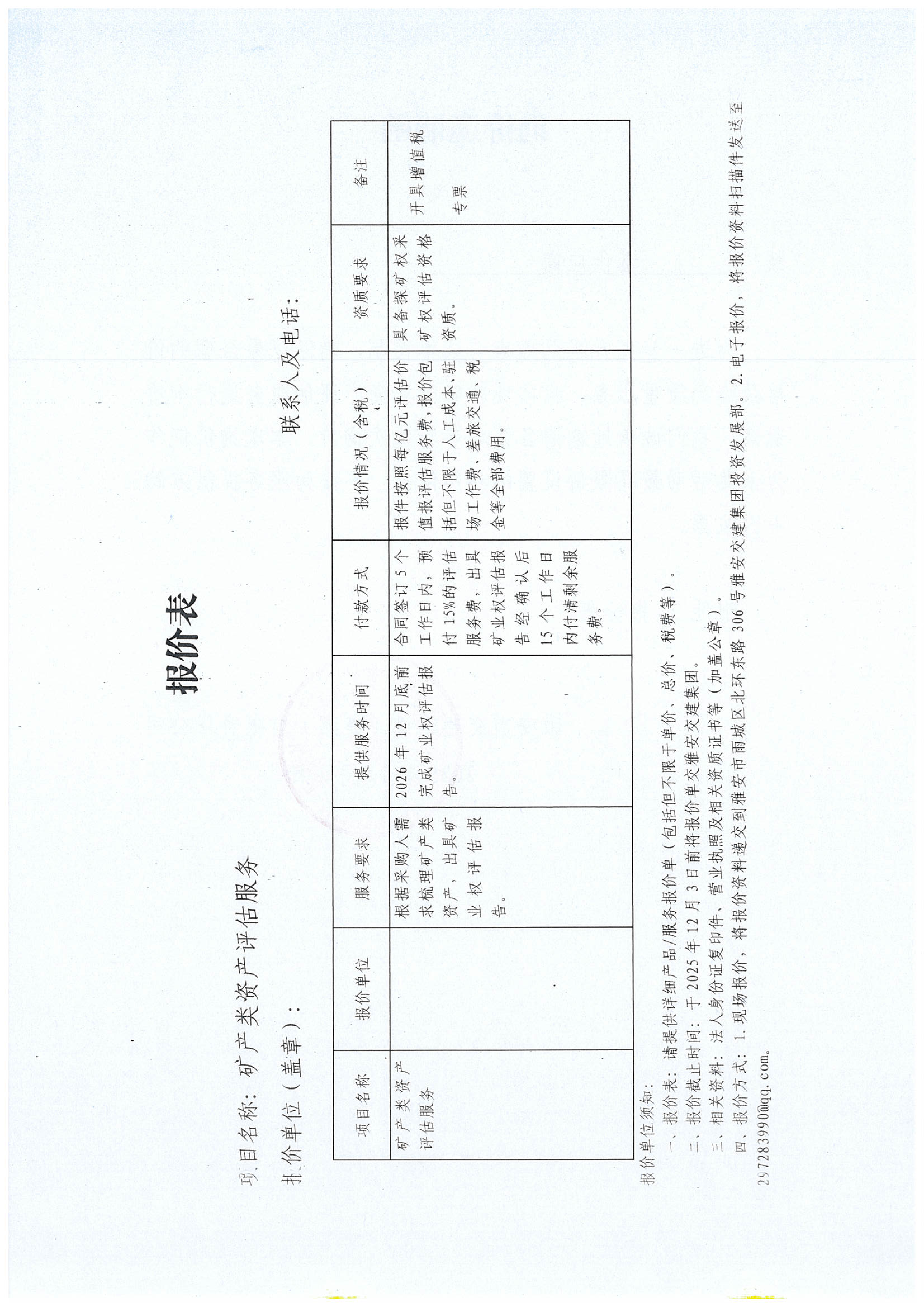 關(guān)于雅安市交通建設(shè)(集團)有限責(zé)任公司礦產(chǎn)類資產(chǎn)評估服務(wù)采購限價的詢價函