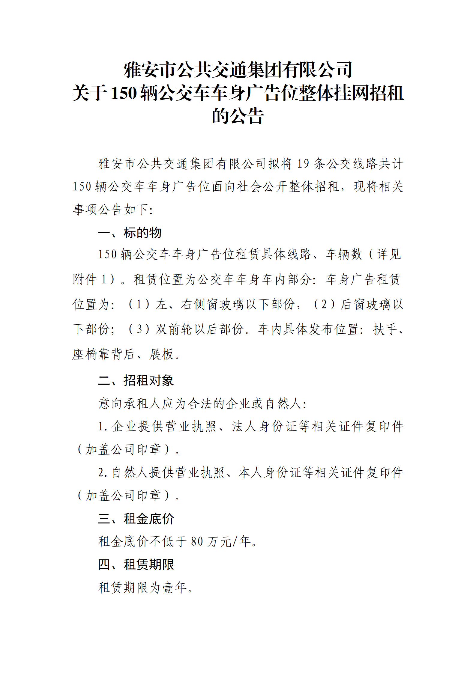 雅安市公共交通集團有限公司 關(guān)于150輛公交車車身廣告位整體掛網(wǎng)招租的公告